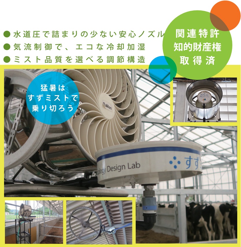 「すずミスト」は水を微細な霧の状態にして噴射し蒸発の際の気化熱の吸収を利用して周囲を冷却します。電力不要で水道の水圧だけで微細な水の粒子を作れるのが、特許を取得したすずミストの技術です。